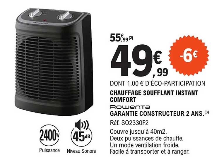 Découvrez l'offre de Chauffage Soufflant Instant Comfort Rowenta chez E.Leclerc Brico! Cette offre fantastique est maintenant disponible dans le nouveau catalogue de E.Leclerc Brico. Profitez de cette occasion et économisez considérablement sur votre achat.