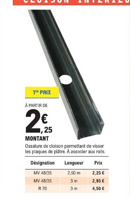 Découvrez une offre exceptionnelle sur les montants pour cloisons intérieures chez E.Leclerc Brico ! À partir de 2,25 €, vous pouvez donner vie à vos projets d'aménagement intérieur en toute simplicité. Ce produit est idéal pour fixer vos plaques de plâtre, offrant une solution solide et durable pour toutes vos rénovations.
