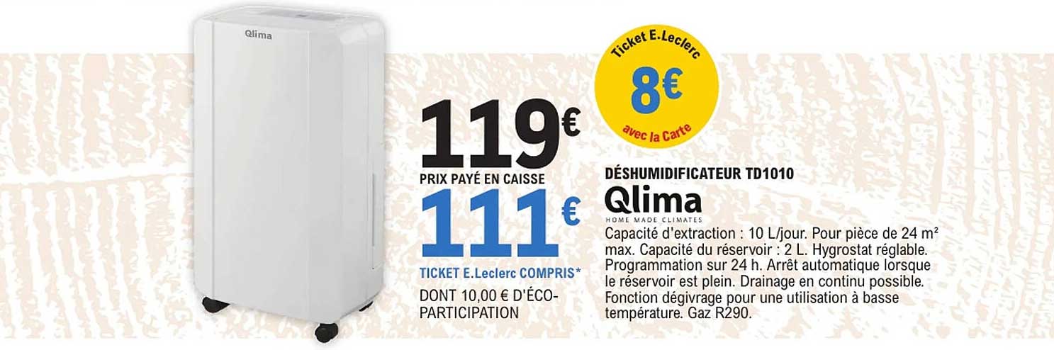 Découvrez l'offre de Déshumidificateur Td1010 Qlima chez E.Leclerc Brico! Cette offre fantastique est maintenant disponible dans le nouveau catalogue de E.Leclerc Brico. Profitez de cette occasion et économisez considérablement sur votre achat.