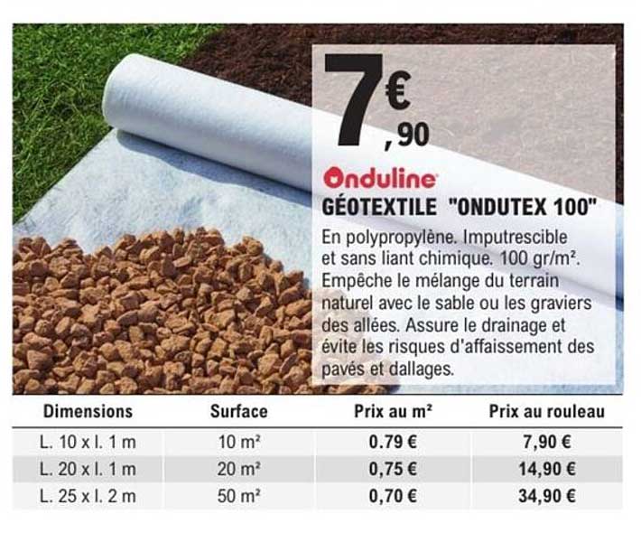 Découvrez le GÉOTEXTILE "ONDUTEX 100" d'Onduline, l'accessoire indispensable pour tous vos projets d'aménagement extérieur. Que vous souhaitiez aménager votre jardin ou construire une allée, ce géotextile en polypropylène est l'allié idéal pour séparer le sol naturel des graviers ou du sable. Avec un prix attractif à partir de 7,90 €, cette offre est à ne pas manquer !