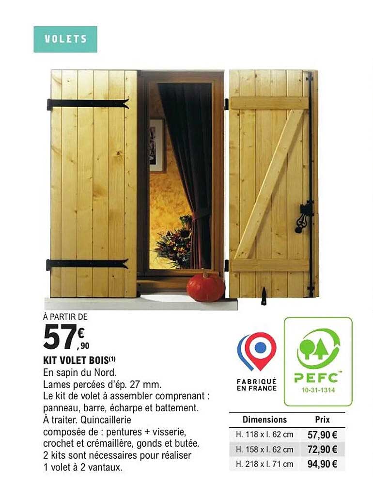 Découvrez l'offre de Kit Volet Bois chez E.Leclerc Brico! Cette offre fantastique est maintenant disponible dans le nouveau catalogue de E.Leclerc Brico. Profitez de cette occasion et économisez considérablement sur votre achat.