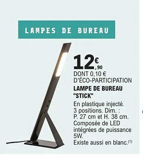 Découvrez l'offre de Lampe De Bureau "Stick" chez E.Leclerc Brico! Cette offre fantastique est maintenant disponible dans le nouveau catalogue de E.Leclerc Brico. Profitez de cette occasion et économisez considérablement sur votre achat.