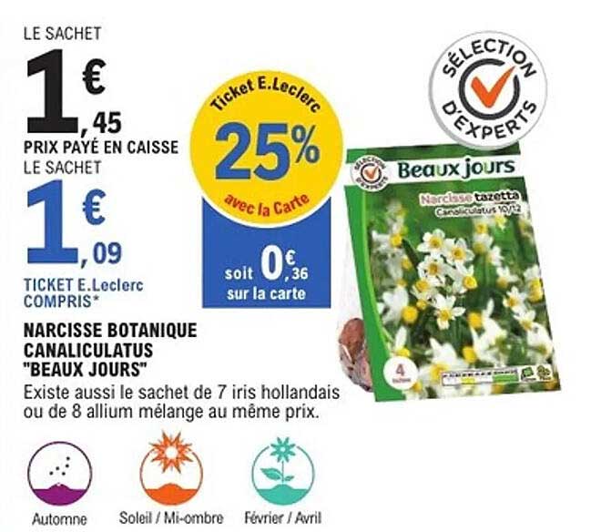 Découvrez dès maintenant la offre NARCISSE BOTANIQUE CANALICULATUS "BEAUX JOURS" dans le catalogue de E.Leclerc Brico. Cette offre est valable du 23/09/2025 au 04/10/2025.