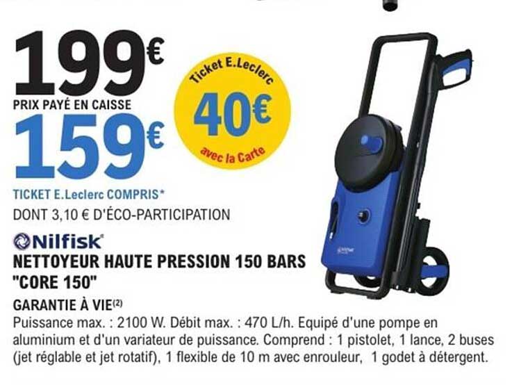Découvrez dès maintenant la offre NETTOYEUR HAUTE PRESSION 150 BARS "CORE 150" dans le catalogue de E.Leclerc Brico. Cette offre est valable du 25/03/2025 au 12/04/2025.