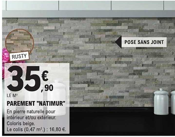 Découvrez un excellent moyen de transformer vos espaces avec le parement "NATIMUR" disponible chez E.Leclerc Brico. Ce magnifique parement en pierre naturelle est idéal pour apporter une touche d'élégance à vos murs, tant à l'intérieur qu'à l'extérieur. Avec un prix attractif de 35,90 € le m², il s'agit d'une opportunité à ne pas manquer pendant la période de promotion.