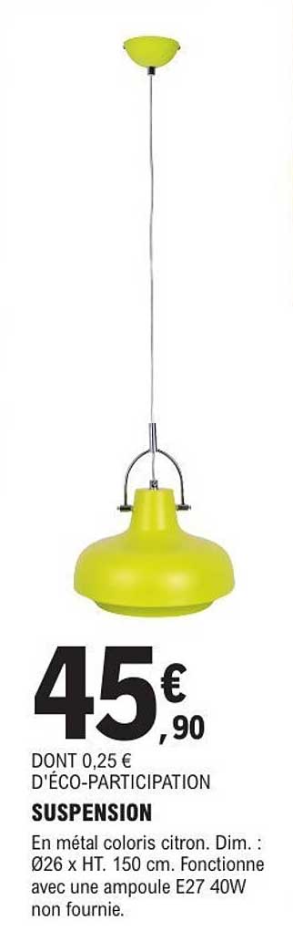 Vous recherchez une touche de couleur et de modernité pour votre intérieur ? Ne cherchez plus ! Cette suspension en métal coloris citron est l'élément qu'il vous faut. Avec son design tendance et éclatant, elle apporte une note joyeuse à n'importe quelle pièce, tout en étant fonctionnelle. Disponible dans le catalogue E.Leclerc Brico, cette offre spéciale est une excellente opportunité pour rénover votre déco sans trop dépenser.
