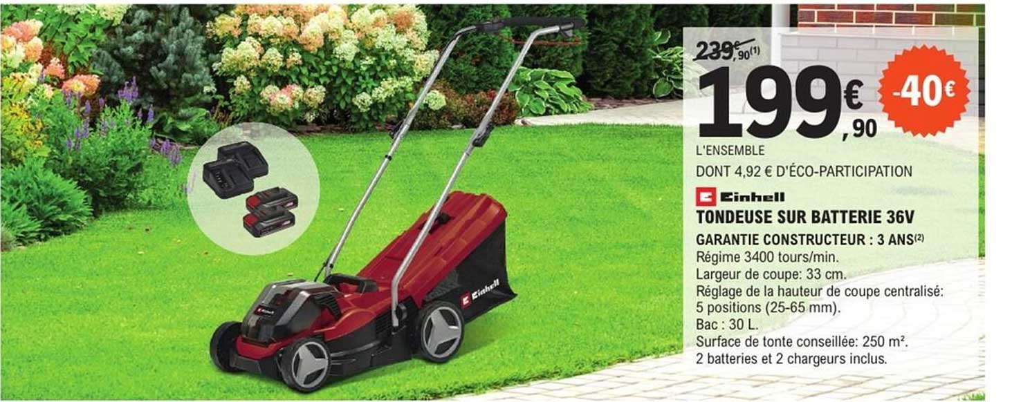 Découvrez dès maintenant la offre TONDEUSE SUR BATTERIE 36V dans le catalogue de E.Leclerc Brico. Cette offre est valable du 25/03/2025 au 12/04/2025.