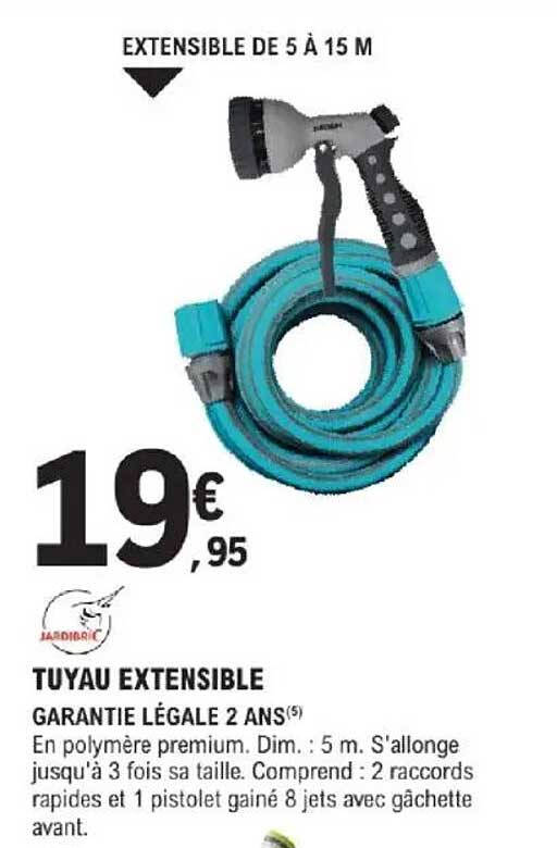 Découvrez dès maintenant la offre TUYAU EXTENSIBLE dans le catalogue de E.Leclerc Brico. Cette offre est valable du 22/04/2025 au 03/05/2025.