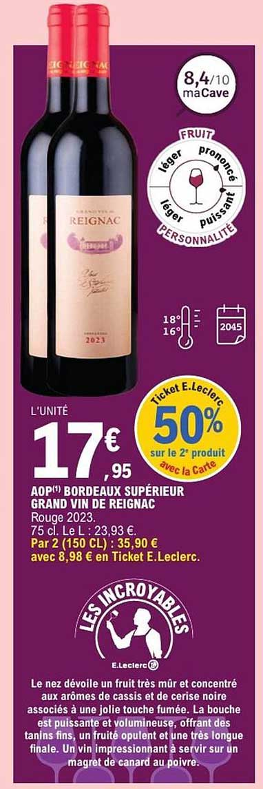 Découvrez dès maintenant la offre AOP Bordeaux Supérieur Grand Vin de Reignac Rouge 2023 dans le catalogue de E.Leclerc Express. Cette offre est valable du 30/09/2025 au 11/10/2025.