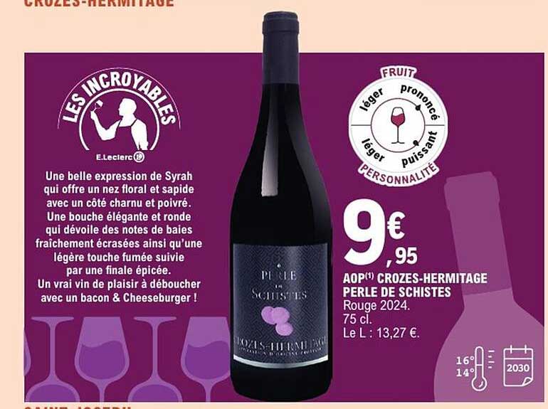 Découvrez dès maintenant la offre AOP(*) CROZES-HERMITAGE PERLE DE SCHISTES dans le catalogue de E.Leclerc Express. Cette offre est valable du 30/09/2025 au 11/10/2025.