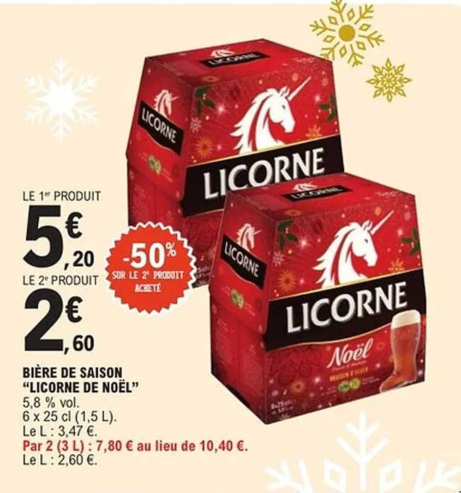 Découvrez dès maintenant la offre BIÈRE DE SAISON "LICORNE DE NOËL" dans le catalogue de E.Leclerc Express. Cette offre est valable du 04/11/2025 au 15/11/2025.