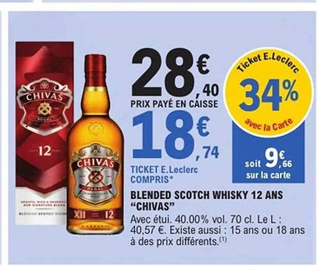 Découvrez le Blended Scotch Whisky 12 ans “Chivas”, un élixir qui promet de ravir vos papilles avec ses saveurs riches et complexes. C'est une offre incontournable pour les amateurs de whisky, disponible ici à un prix imbattable. Cette promotion vous permet de profiter d'une excellente qualité à un prix réduit, afin de savourer des moments de convivialité autour de ce précieux nectar.