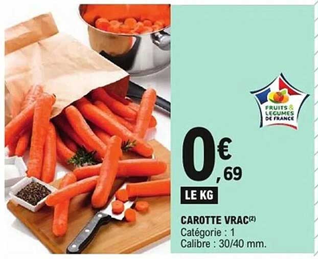 Profitez d'une promotion incroyable sur les carottes vrac lors de votre passage chez E.Leclerc Express. Avec un prix exceptionnel de 0,69€ le kg, cette offre est idéale pour garnir vos plats de légumes frais et savoureux. Les carottes sont un élément essentiel d'une alimentation équilibrée et apportent vitamines et nutriments à votre table.
