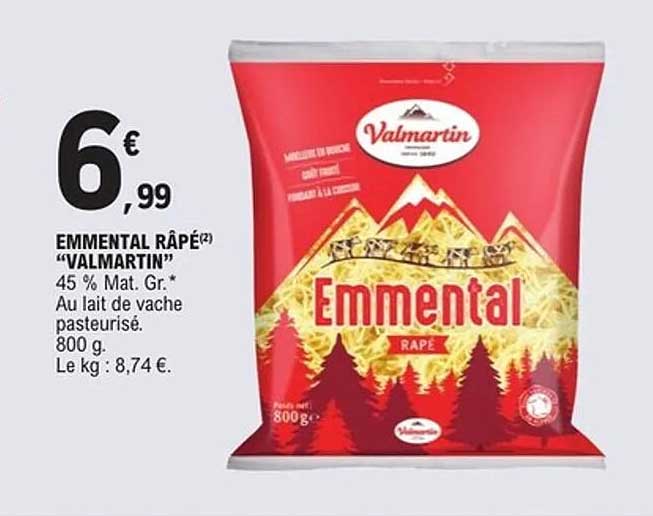 Vous cherchez une touche savoureuse pour vos plats ? Découvrez l'Emmental Râpé Valmartin, un produit de qualité à utiliser dans une variété de recettes. Profitez d'une offre exceptionnelle valable du 4 au 15 novembre 2025, parfaite pour agrémenter vos repas avec ce fromage délicieusement fondant.