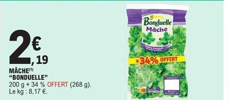 Découvrez dès maintenant la offre Mâche "Bonduelle" 200 g + 34 % OFFERT (268 g). dans le catalogue de E.Leclerc Express. Cette offre est valable du 07/10/2025 au 18/10/2025.