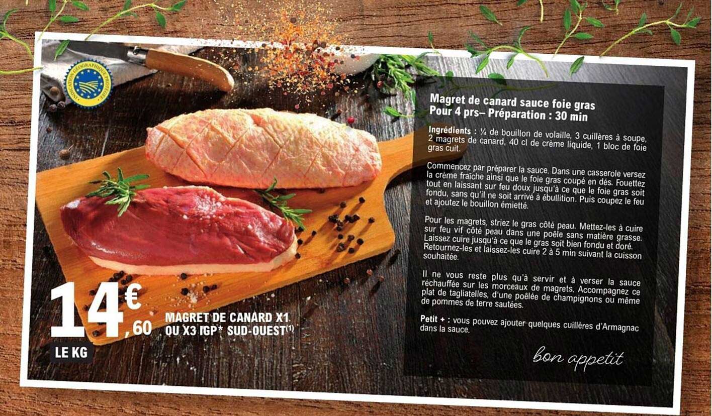 Actuellement proposé à seulement 14,60€ le kg, ce magret de canard est une offre à ne pas manquer. Comparé à son prix habituel, cette promotion vous permet de réaliser des économies tout en profitant d'un produit haut de gamme. Pourquoi attendre ? Faites le plein de saveurs !