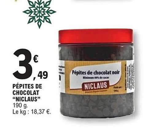 Les amateurs de chocolat vont adorer cette promotion sur les pépites de chocolat noir Niclaus ! Délicate et riche, cette douceur est idéale pour agrémenter vos pâtisseries, gâteaux et même vos desserts gourmands. Profitez de cette incroyable offre qui vous permet d'apporter une touche de chocolat à toutes vos créations culinaires. C'est une excellente occasion de faire le plein de saveurs à moindre coût.