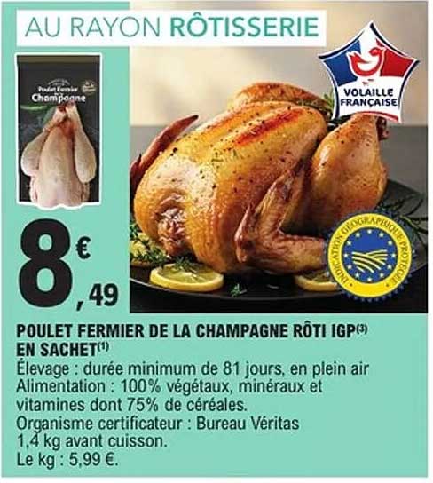 Découvrez une offre gourmande et savoureuse avec le Poulet Fermier de la Champagne Rôti IGP. Ce poulet, élevé en plein air et dans le respect de la tradition, promet des saveurs authentiques qui raviront vos papilles. Profitez de cette occasion exceptionnelle pour apporter de la qualité à vos repas. Disponible du 9 au 12 juillet 2025, cette offre est une véritable aubaine pour les amateurs de bonnes viandes.