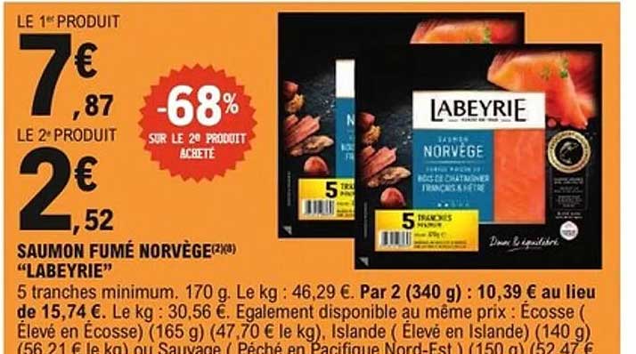 Vous cherchez à rehausser vos plats avec une touche de finesse ? Le saumon fumé norvégien de Labeyrie est une excellente option pour vos apéritifs ou vos repas. Profitez d'une promotion exceptionnelle avec un prix réduit, parfait pour les amateurs de saveurs marines.