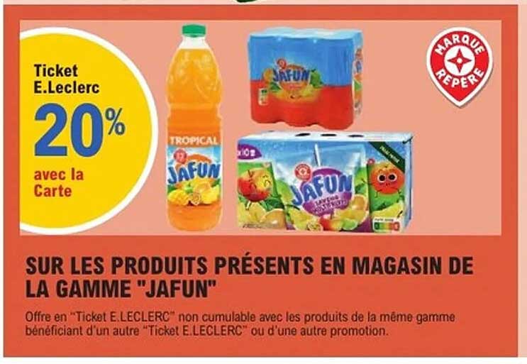 Profitez d'une réduction exceptionnelle de 20% sur une sélection des produits de la gamme "Jafun" disponible dans les magasins E.Leclerc Express. Cette offre, valable jusqu'au 11 octobre 2025, est idéale pour faire le plein de bonnes affaires tout en savourant des boissons rafraîchissantes et des snacks pour toute la famille.
