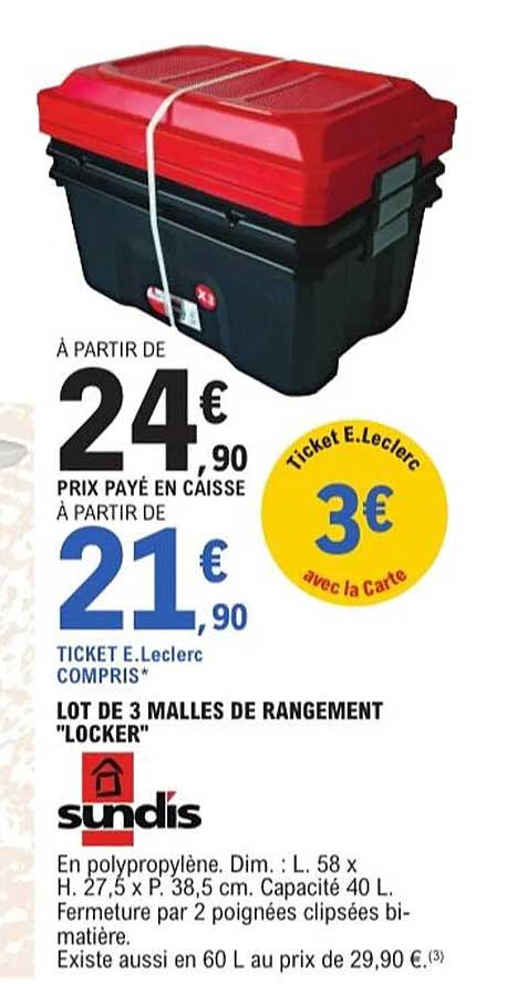 Profitez d'une offre exceptionnelle avec un prix à partir de 21,90 € au lieu de 24,90 €. De plus, avec le ticket E.Leclerc, vous économisez 3 € supplémentaires. C'est l'occasion rêvée pour renouveler votre équipement de rangement à petit prix !