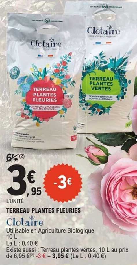 Découvrez notre incroyable offre sur le terreau pour plantes fleuries Clotaire, idéal pour donner à vos fleurs l'énergie dont elles ont besoin pour s'épanouir. Pendant la période du 14 au 25 octobre 2025, profitez d'un prix exceptionnel de 3,95 € au lieu de 6,95 €, une belle occasion de chouchouter votre jardin.