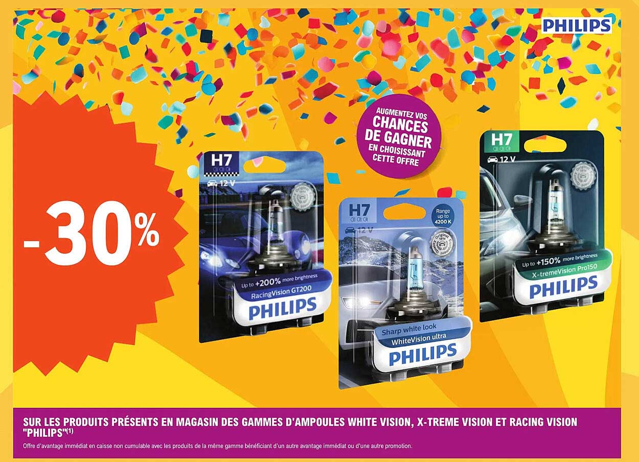 Offre de Philips H7 Racingvision Gt200, Philips H7 Whitevision Ultra, Philips H7 X-Tremevision Pro150 chez E.Leclerc L'Auto