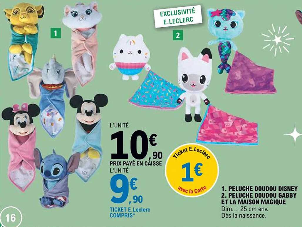 Découvrez dès maintenant la offre 1. PELUCHE DOUROU DISNEY 2. PELUCHE DOUROU GABBY ET LA MAISON MAGIQUE dans le catalogue de E.Leclerc. Cette offre est valable du 18/10/2024 au 22/12/2024.