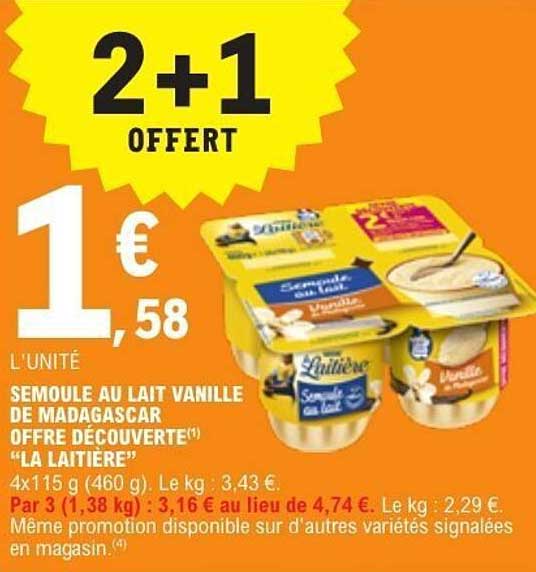Découvrez une offre irrésistible sur la semoule au lait vanille de Madagascar, proposée par La Laitière. Pour une durée limitée, profitez de l’offre « 2+1 offert » et savourez un délicieux dessert crémeux qui ravira toute la famille. Que ce soit pour un goûter gourmand ou un dessert rapide, ce produit saura vous séduire par sa texture onctueuse et son goût délicat de vanille.