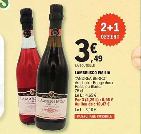 Faites le plein de bonne humeur avec l'offre exceptionnelle sur le Lambrusco Emilia "Andrea Berro". Ce vin pétillant, que vous pouvez choisir en rouge, rosé ou blanc, est parfait pour toutes vos occasions festives. À seulement 3,49 € la bouteille, c'est une belle opportunité de régaler vos amis et votre famille sans exploser votre budget.