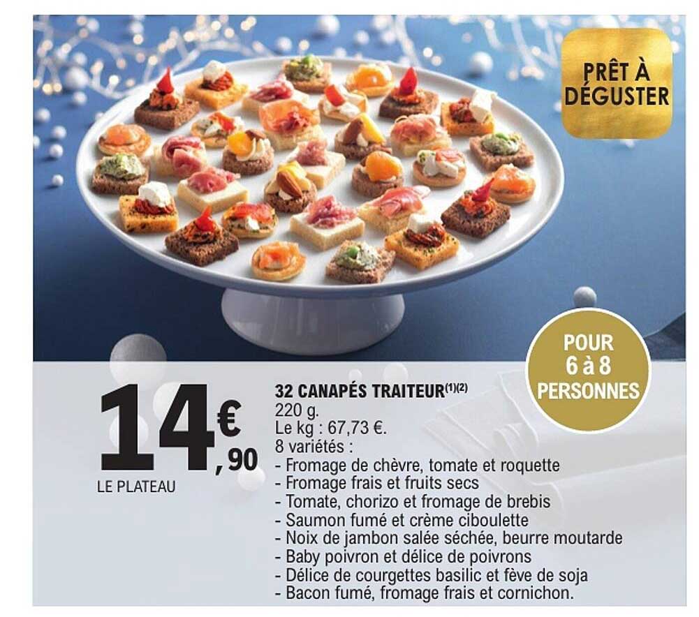 Découvrez l'offre de 32 Canapés Traiteur chez E.Leclerc! Cette offre fantastique est maintenant disponible dans le nouveau catalogue de E.Leclerc. Profitez de cette occasion et économisez considérablement sur votre achat.