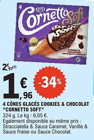 Découvrez dès maintenant la offre 4 Cônes Glacés Cookies & Chocolat "Cornetto Soft" dans le catalogue de E.Leclerc. Cette offre est valable du 18/03/2025 au 29/03/2025.