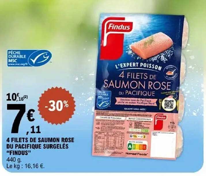 Découvrez l'offre de 4 Filets De Saumon Rose Du Pacifique Surgelés "Findus" chez E.Leclerc! Cette offre fantastique est maintenant disponible dans le nouveau catalogue de E.Leclerc. Profitez de cette occasion et économisez considérablement sur votre achat.