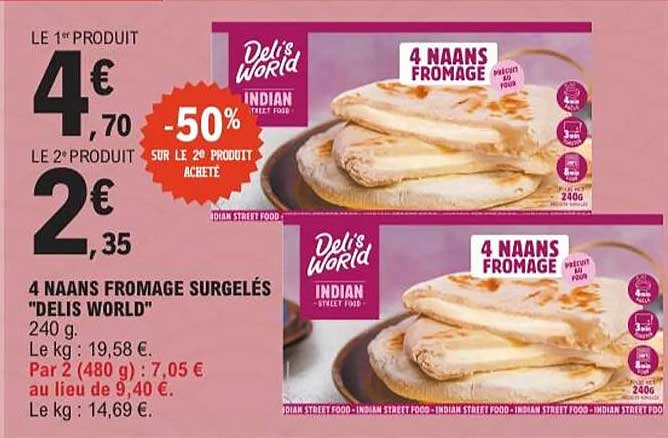 Découvrez l'offre de 4 Naans Fromage Surgelés "Delis World" chez E.Leclerc! Cette offre fantastique est maintenant disponible dans le nouveau catalogue de E.Leclerc. Profitez de cette occasion et économisez considérablement sur votre achat.