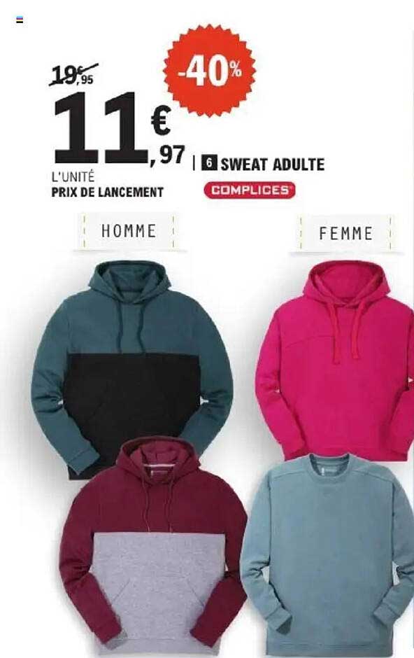 Découvrez dès maintenant la offre 6 SWEAT ADULTE -40% dans le catalogue de E.Leclerc. Cette offre est valable du 16/09/2025 au 27/09/2025.