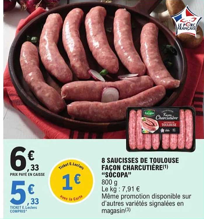 Découvrez l'offre de 8 Saucisses De Toulouse Façon Charcutière "Socopa" chez E.Leclerc! Cette offre fantastique est maintenant disponible dans le nouveau catalogue de E.Leclerc. Profitez de cette occasion et économisez considérablement sur votre achat.