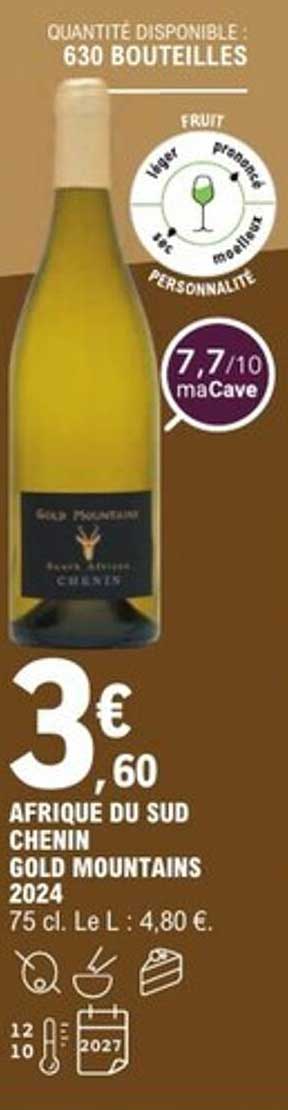 Découvrez l'offre de Afrique Du Sud Chenin Gold Mountains 2024 chez E.Leclerc! Cette offre fantastique est maintenant disponible dans le nouveau catalogue de E.Leclerc. Profitez de cette occasion et économisez considérablement sur votre achat.