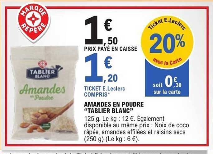 Découvrez dès maintenant la offre AMANDES EN POUDRE "TABLIER BLANC" dans le catalogue de E.Leclerc. Cette offre est valable du 14/10/2025 au 25/10/2025.