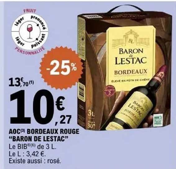 Offre de Aoc Bordeaux Rouge "Baron De Lestac" chez E.Leclerc