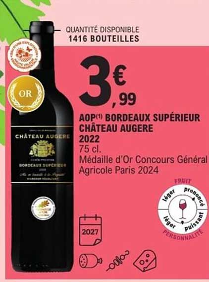 Découvrez dès maintenant la offre AOP(*) BORDEAUX SUPÉRIEUR CHÂTEAU AUGERE 2022 dans le catalogue de E.Leclerc. Cette offre est valable du 01/10/2024 au 13/10/2024.