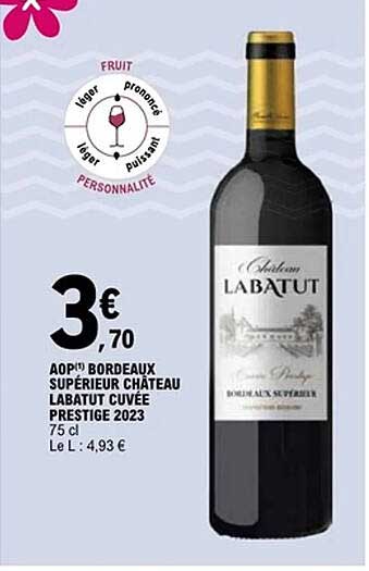 Découvrez dès maintenant la offre AOP® Bordeaux Supérieur Château Labatut Cuvée Prestige 2023 dans le catalogue de E.Leclerc. Cette offre est valable du 15/04/2025 au 19/04/2025.