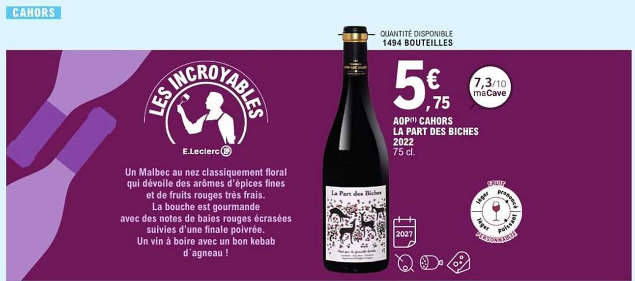 Offre de Aop Cahors La Part Des Biches 2022 chez E.Leclerc