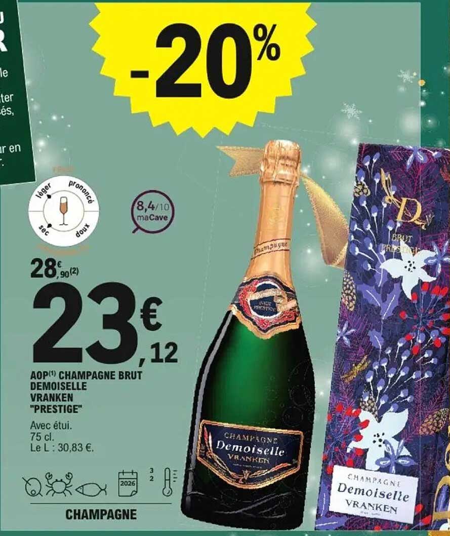 Découvrez dès maintenant la offre AOP Champagne Brut Demoiselle Vranken "Prestige" dans le catalogue de E.Leclerc. Cette offre est valable du 10/12/2024 au 24/12/2024.