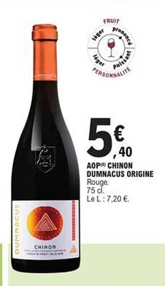 Découvrez dès maintenant la offre AOP Chinon Dumnacus Origine Rouge dans le catalogue de E.Leclerc. Cette offre est valable du 21/10/2025 au 30/10/2025.