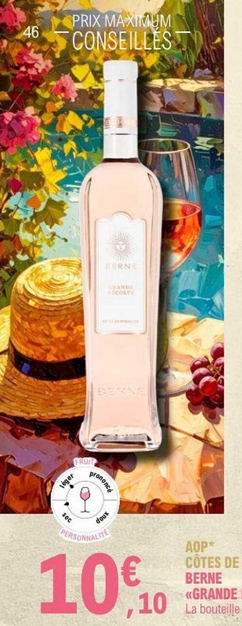 Découvrez dès maintenant la offre AOP* Côtes de Berne «Grande» La bouteille dans le catalogue de E.Leclerc. Cette offre est valable du 03/09/2025 au 11/09/2025.