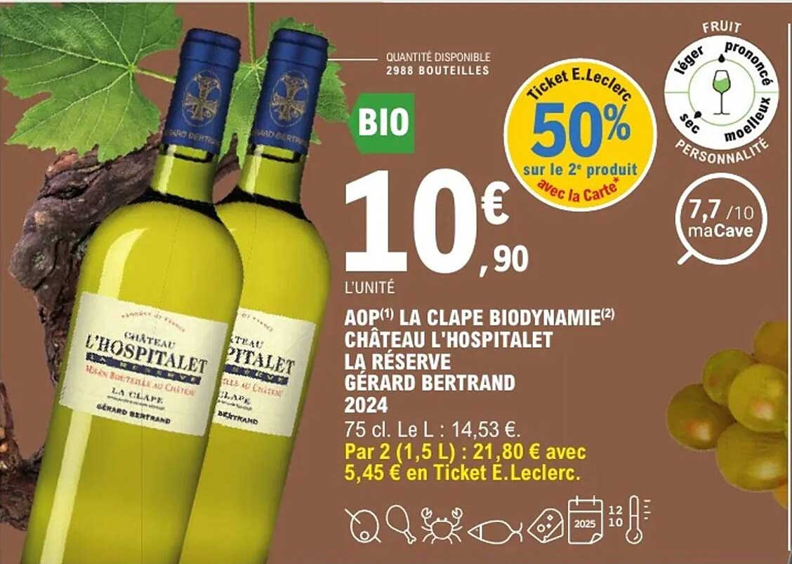 Découvrez dès maintenant la offre AOP La Clape Biodynamie Château L'Hospitalet La Réserve Gérard Bertrand 2024 dans le catalogue de E.Leclerc. Cette offre est valable du 27/09/2025 au 11/10/2025.