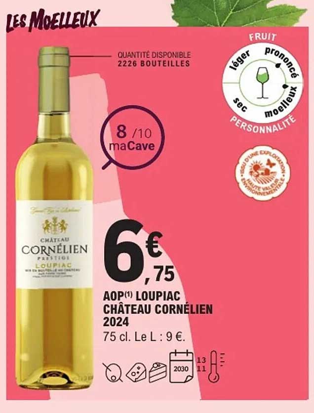 Découvrez dès maintenant la offre AOP(*) Loupiac Château Cornélien 2024 dans le catalogue de E.Leclerc. Cette offre est valable du 27/09/2025 au 11/10/2025.