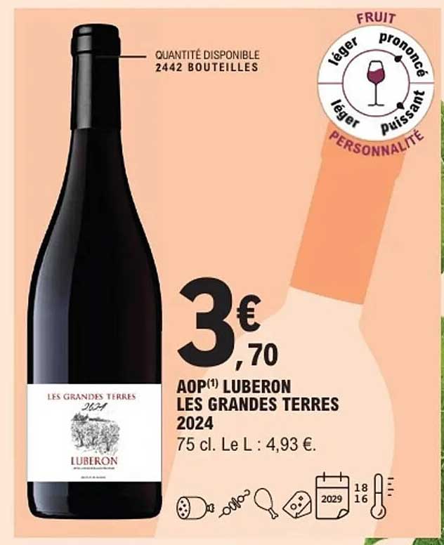 Découvrez dès maintenant la offre AOP Luberon Les Grandes Terres 2024 dans le catalogue de E.Leclerc. Cette offre est valable du 27/09/2025 au 11/10/2025.