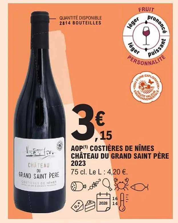Découvrez dès maintenant la offre AOP(1) COSTIÈRES DE NÎMES CHÂTEAU DU GRAND SAINT PÈRE 2023 dans le catalogue de E.Leclerc. Cette offre est valable du 27/09/2025 au 11/10/2025.