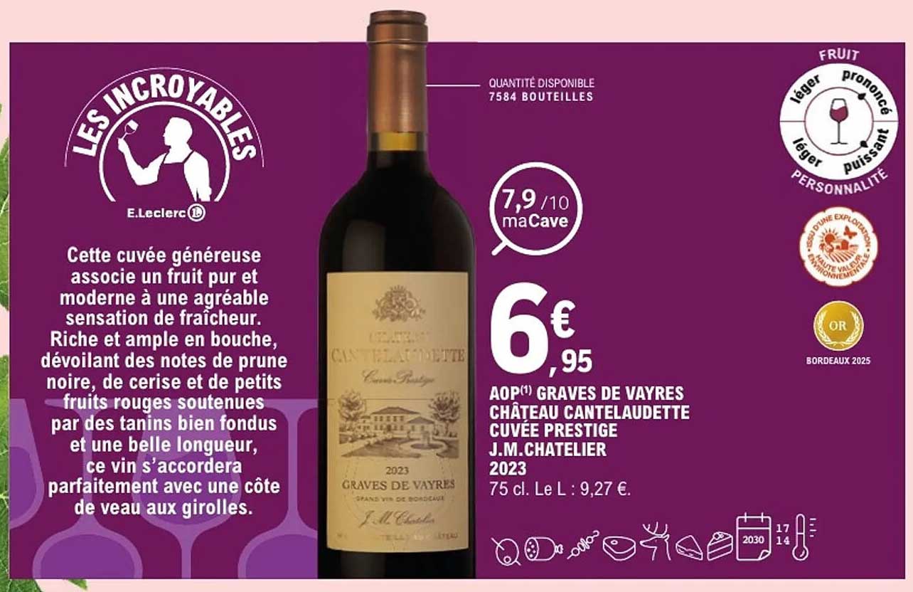 Découvrez dès maintenant la offre AOP(1) GRAVES DE VAYRES CHÂTEAU CANTELAUDTE CUVÉE PRESTIGE J.M.CHATELIER 2023 dans le catalogue de E.Leclerc. Cette offre est valable du 27/09/2025 au 11/10/2025.